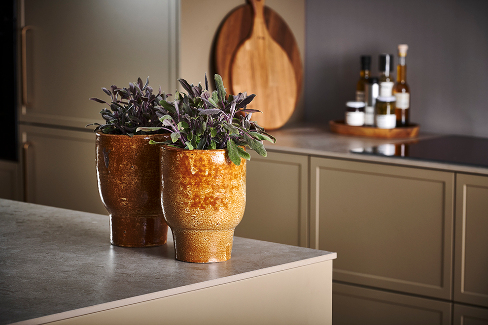 Linoleum har länge varit ett populärt material i både golv och bänkskivor med sin sammetslena finish. Vi såg möjligheten i det vackra, naturliga materialet och tog fram ett nytt kökskoncept med linoleumluckor och fronter.