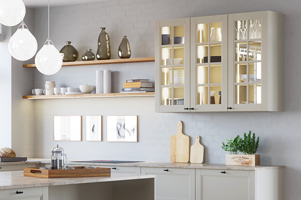 Vitrinskåp har länge varit en favorit i nordiska hem. Våra vitrinskåp går att kombinera med alla köksmodeller och skräddarsys efter dina önskemål kring val av glas, hyllplan och belysning. Vårt senaste vitrinskåp har tagits fram för att kombinera värme och trivsel med en modern touch av strikt, industriell design. Ge köket liv med ett vackert vitrinskåp.