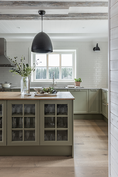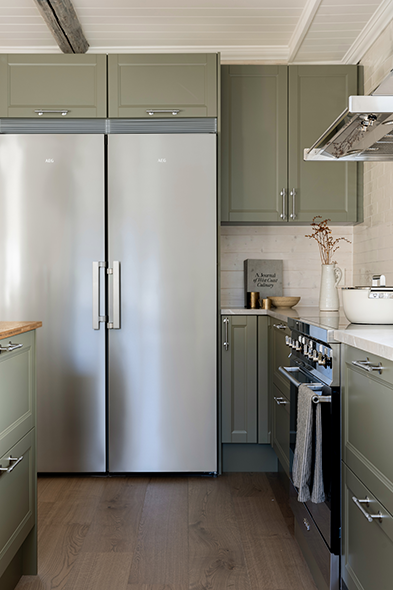 Köket var en tydlig målbild. Redan från början hade paret en ganska klar bild av vad de ville ha. Ett stort lantkök, med skafferi och den gamla vedspisen bevarad. Emma och Sebastian var nöjda med både kök och kontakten med Electrolux Home i Örnsköldsvik sedan renoveringen av lägenheten – ett JKE-kök kändes därför som en självklarhet.