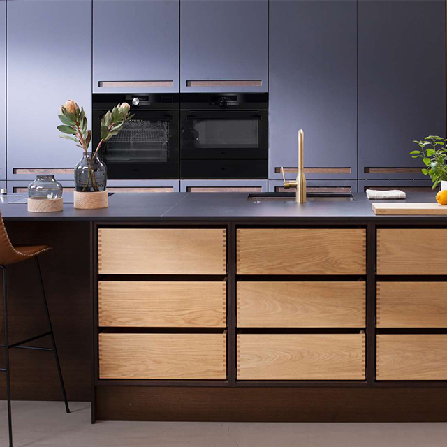 Blått är ytterligare en kulör med en oerhört bred och varierad palett av ljusa och mörka nyanser. En mörkare ton som en djup midnattsblå ger ett sobert och stilrent intryck, och passar bra ihop med mörka vitvaror, bänkskivor och andra köksdetaljer. Du kan även använda en bänkskiva eller köksluckor i ljusare trä för att ge köket en mjukare look. Ett blått kök kombineras också lämpligen med detaljer i mässing, såsom blandare och kökshandtag.