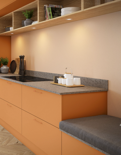 Ett kök i orange för tankarna till det glada 60-talet – en tidsepok som präglades av vågade färgval inom såväl heminredning som mode. Orange är en djup, levande färg som piggar upp och höjer trivselnivån var den än används. Fördelen med orange är att den är enkel att para ihop med många jordnära nyanser som beige eller brunt. Känner du dig modig kan orange även med fördel användas som kontrastfärg till klarblåa nyanser som exempelvis koboltblå.
