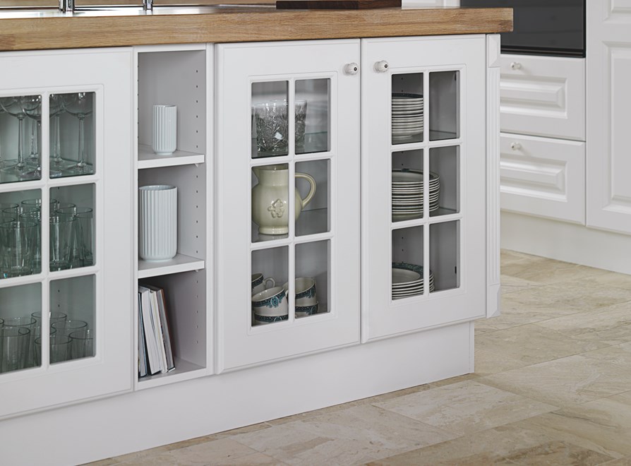 Ett vitrinskåp med eleganta spröjsade fönster ger ett vitt kök en mer öppen atmosfär och ger liv till rummet. Skåpet anpassas enkelt efter stilen som du eftersträvar i ditt kök. Välj ett skåp med utpräglade spröjs och klarglas till ditt lantliga kök. Eller en lucka med helglas för ett modernt vitt kök.