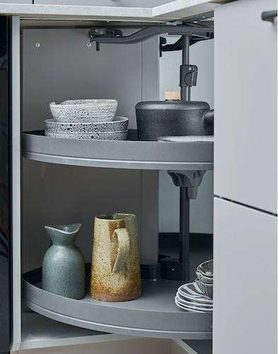 Ytterligare ett tips för praktisk och dold köksförvaring är de så kallade hörnskåpen. Alltför ofta glöms hörnen och dess dolda utrymme bort vid köksplaneringen. Men faktum är att kökets hörn kan rymma mycket plats för skrymmande köksredskap som kastruller och köksmaskiner. Ta tillvara på utrymmet och skapa plats för ett skåp med hörnkarusell där du kan förvara köksmaskiner, grytor och kastruller. Hitta rätt skafferilösning för dig och ditt kök!